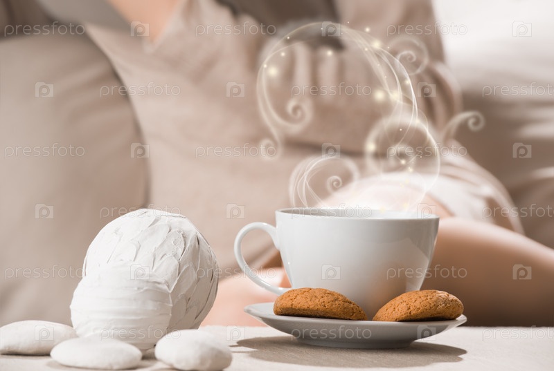Чашка кофе с печеньем на столе. Женщина сидит на заднем плане