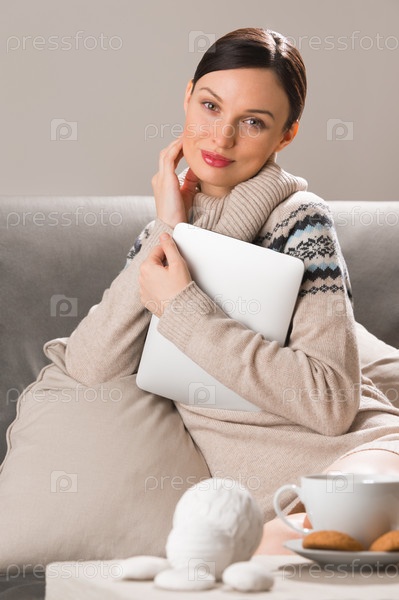 Девушка использует планшетный компьютер дома перед сном. Чашка кофе с печеньем на столе на переднем плане