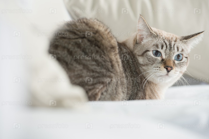 Симпатичная пятнистая кошка лежит на диване дома и смотрит с осторожностью