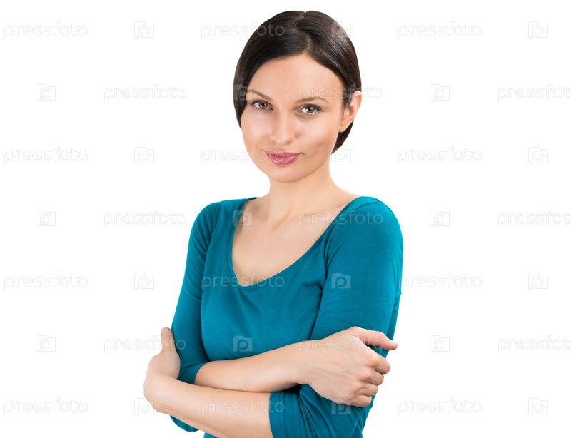 Молодая красивая женщина стоит со сложенными руками, изолированная на белом фоне
