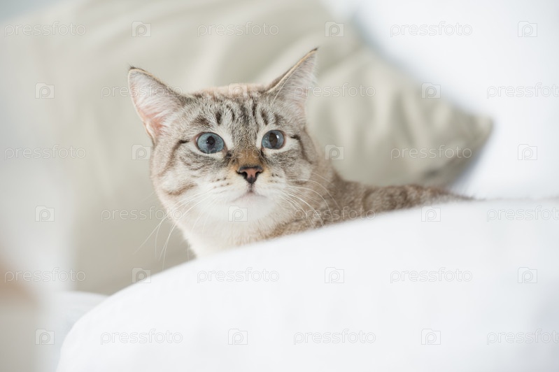 Симпатичная пятнистая кошка лежит на диване и смотрит с осторожностью