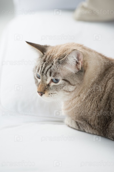 Симпатичная пятнистая кошка лежит на диване и смотрит с осторожностью