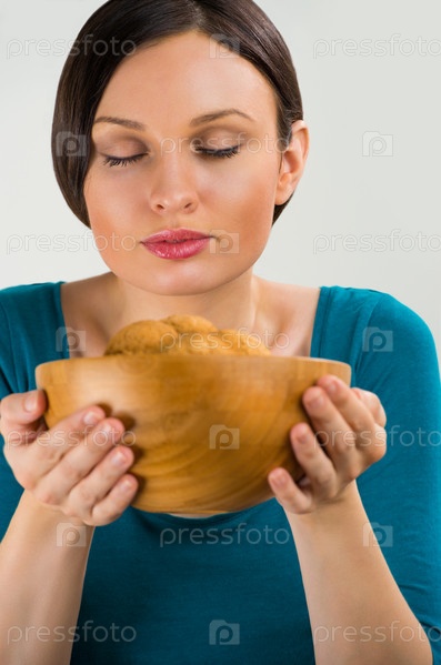 Красивая женщина держит свежее овсяное печенье с закрытыми глазами