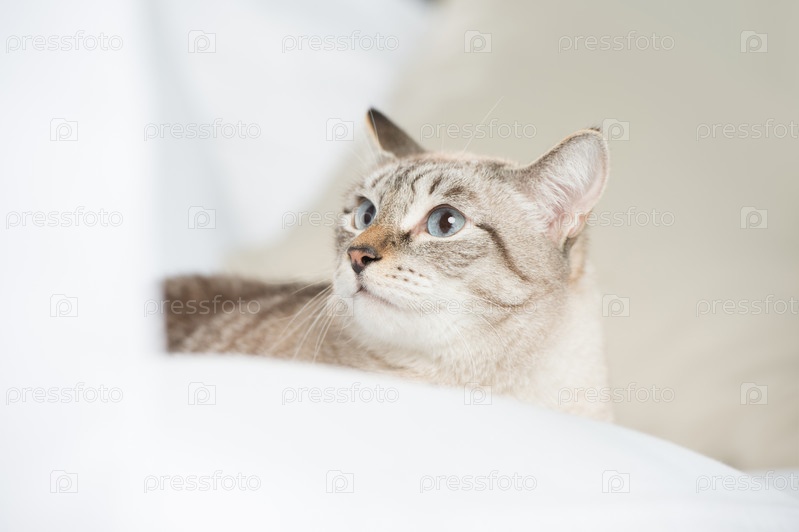 Симпатичная пятнистая кошка лежит на диване и смотрит с осторожностью