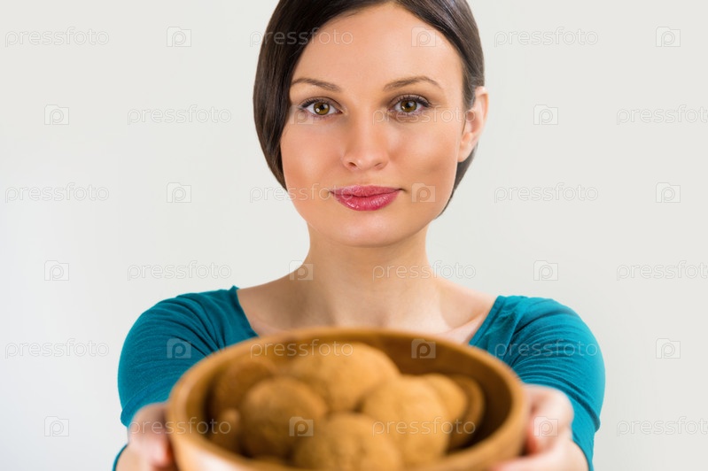 Красивая женщина держит свежее овсяное печенье и улыбается