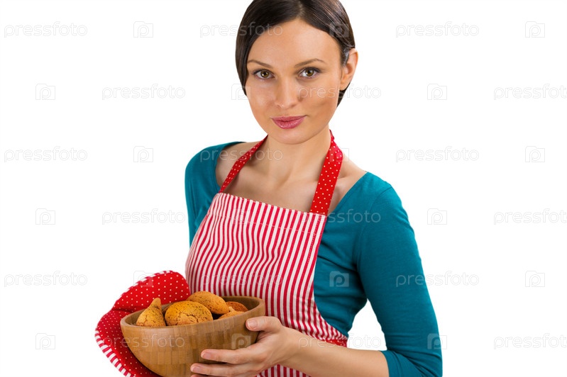Красивая женщина держит свежее овсяное печенье и улыбается