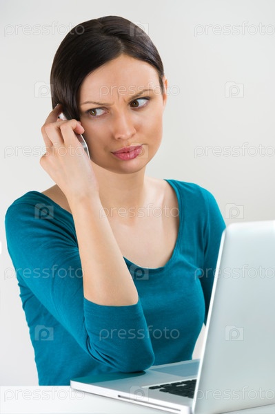 Портрет серьезной молодой женщины, работающей на ноутбуке дома и говорящей по сотовому телефону