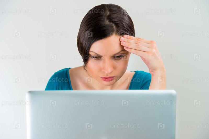 Молодая женщина серьезно думает, держись за голову, работая на ноутбуке