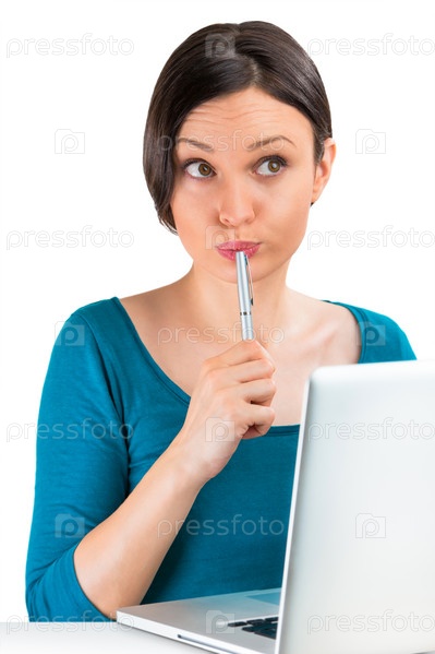 Молодая красивая женщина сидит перед ноутбуком с ручкой и думает о чем-то