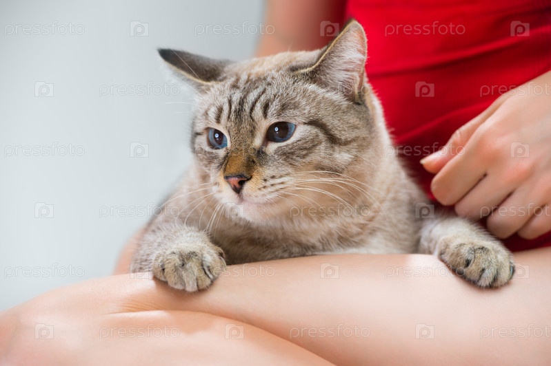 Молодая женщина, держащая красивого кота расцветки табби на сером фоне