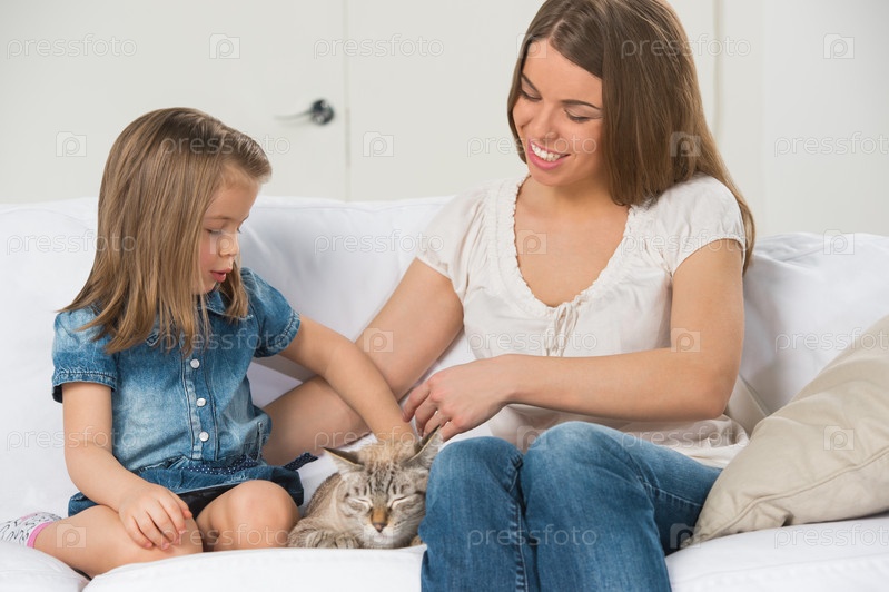 Мать и дочь сидят на диване и обнимают кошку
