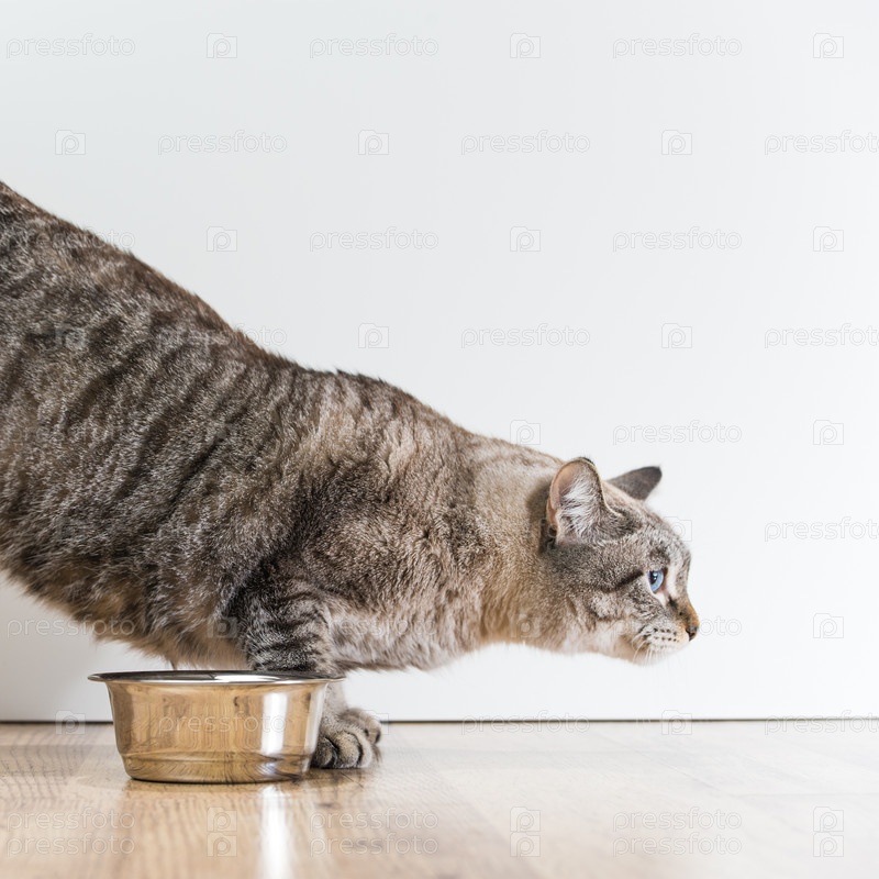 Портрет чистокровной полосатой кошки на сером фоне