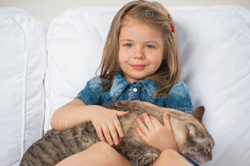 Милая девочка с любовью обнимает пятнистую кошку и смотрит в камеру