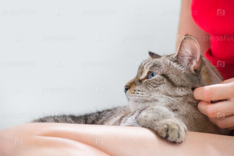 Молодая женщина держит красивого пятнистого кота, отдыхая на сером фоне