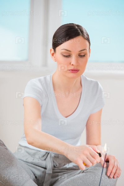 Молодая женщина зажигает ароматическую палочку, сидя на полу