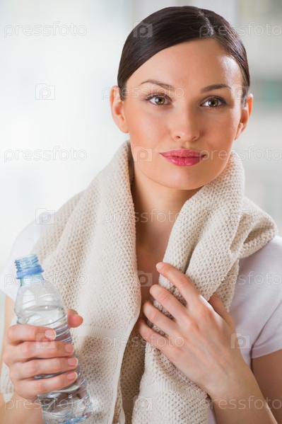 Портрет уверенной молодой женщины в спортивной одежде, держащей бутылку воды в тренажерном зале