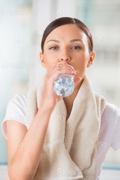 Портрет уверенной молодой женщины в спортивной одежде, держащей бутылку воды в тренажерном зале