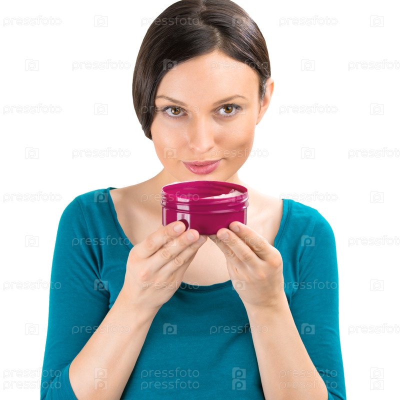 Уход за кожей лица. Красивая женщина с кремом, изолированная на белом фоне