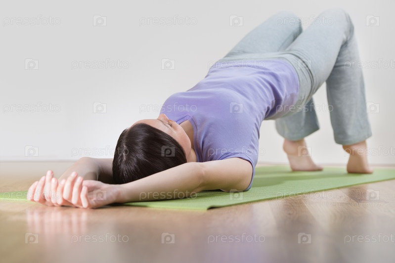 Молодая женщина занимается йогой на коврике