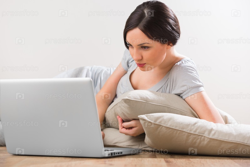 Молодая женщина с ноутбуком лежит на полу