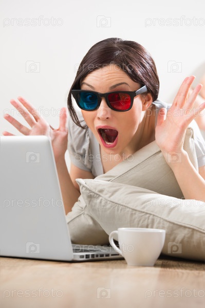 Эмоциональная молодая женщина лежит на полу с чашкой кофе и смотрит фильм в 3D-очках