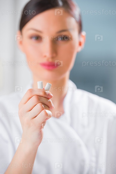 Молодая женщина-стоматолог держит жевательную резинку и улыбается. Концепция гигиены полости рта