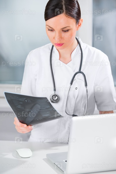 Женщина-врач держит результаты УЗИ и использует ноутбук в клинике