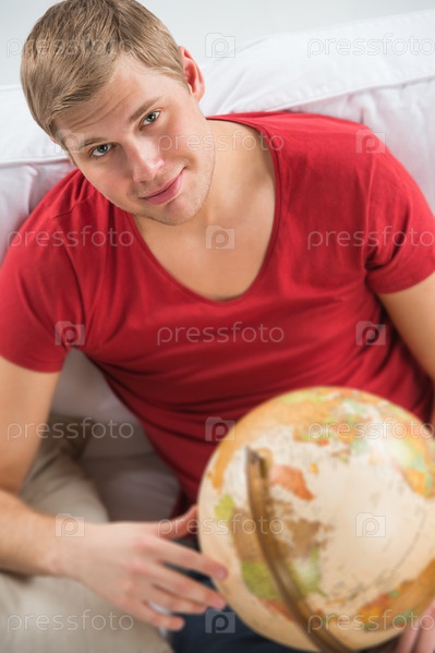 Портрет молодого мужчины с глобусом, планирующего поездку