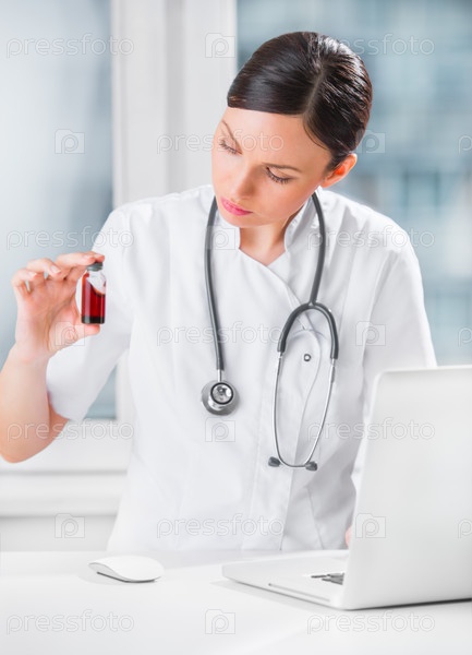 Портрет симпатичной лаборантки, делающей анализ крови на ноутбуке в больнице