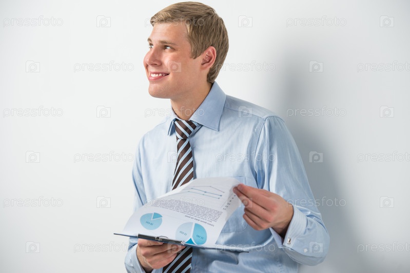 Портрет задумчивого уверенного делового человека с документами, стоящего у стены в офисе