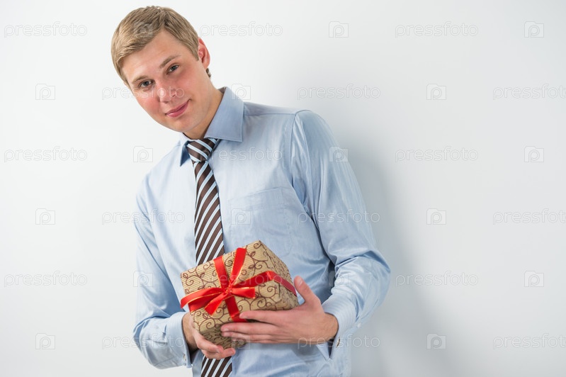 Улыбающийся бизнесмен держит подарочную коробку с красной лентой