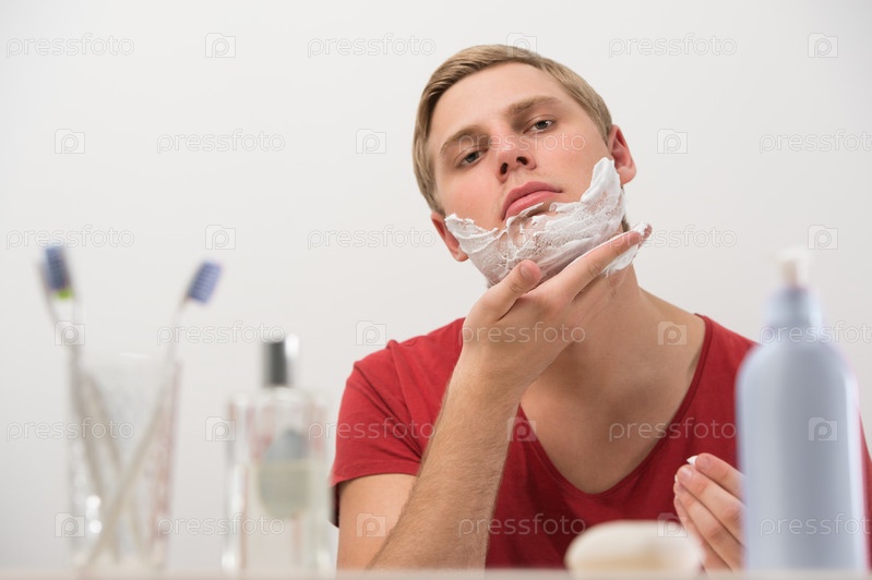 Мужчина наносит крем для бриться