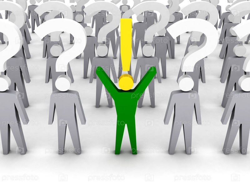 Один человек с восклицательным знаком и много людей с вопросительными.Концептуальная 3D-иллюстрация