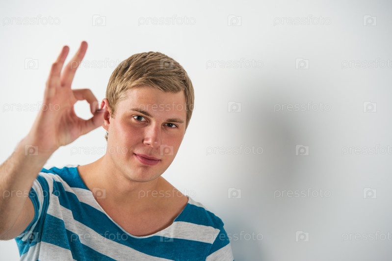 Симпатичный молодой человек с жестом ОК на фоне белой стены