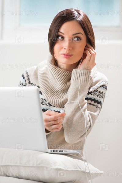 Молодая женщина сидит на полу перед ноутбуком, слушая музыку
