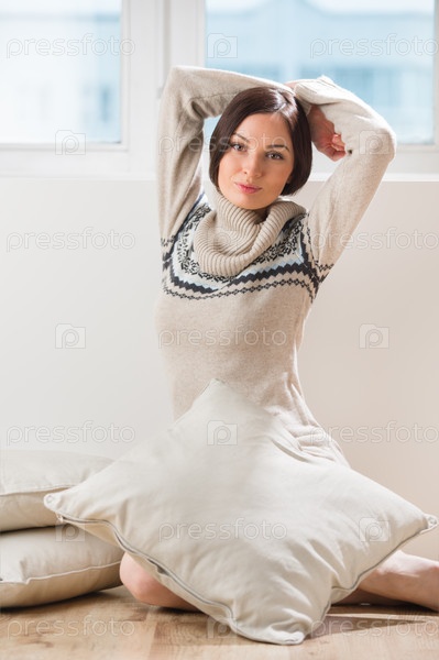 Привлекательная молодая женщина мечтает и скучает по парню, обнимая подушку, в гостиной