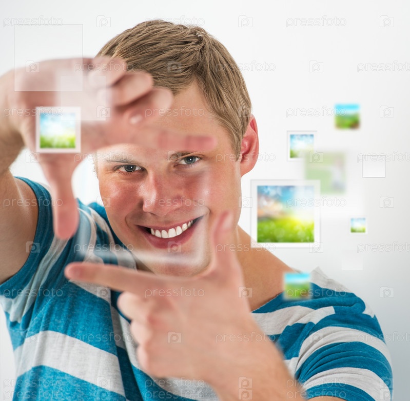 Молодой мужчина с виртуальными фотографиями, летающими вокруг. Загрузка цифровых фотографий в социальные сети