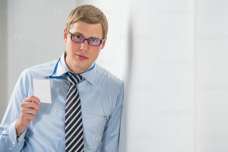 Счастливый бизнесмен показывает чистый пропуск, опираясь на стену в офисе
