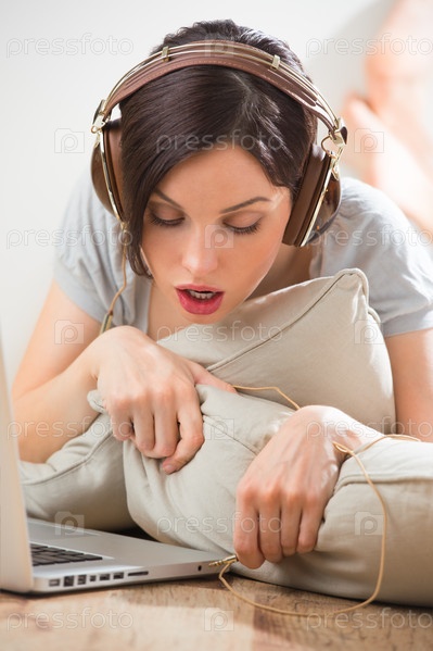 Молодая женщина лежит на полу перед ноутбуком и вставляет наушники чтобы слушать музыку