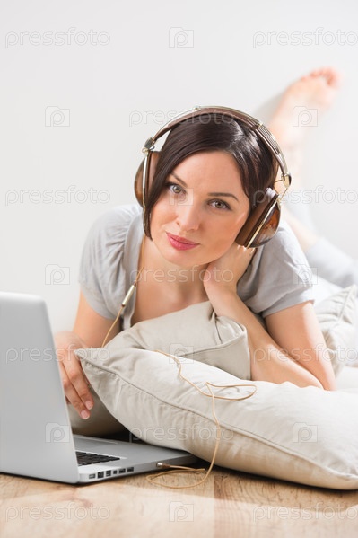 Молодая женщина лежит на полу перед ноутбуком и слушает музыку