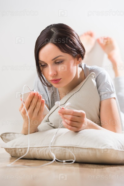 Молодая женщина лежит на полу с телефоном и слушает музыку или общается в чате с друзьями с помощью встроенной камеры