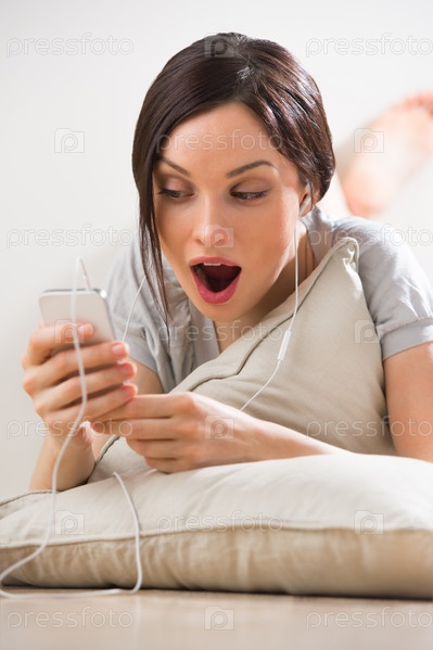Молодая женщина лежит на полу с телефоном и слушает музыку или общается в чате с друзьями с помощью встроенной камеры