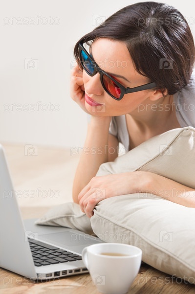 Молодая женщина лежит на полу перед ноутбуком с чашкой чая или кофе в 3D-очках и смотрит фильм