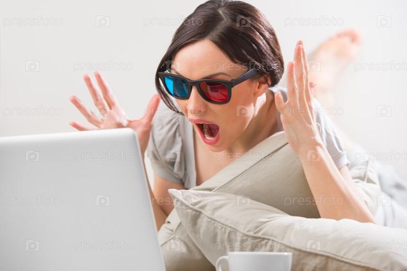 Молодая женщина лежит на полу перед ноутбуком с чашкой чая или кофе в 3D-очках и смотрит фильм