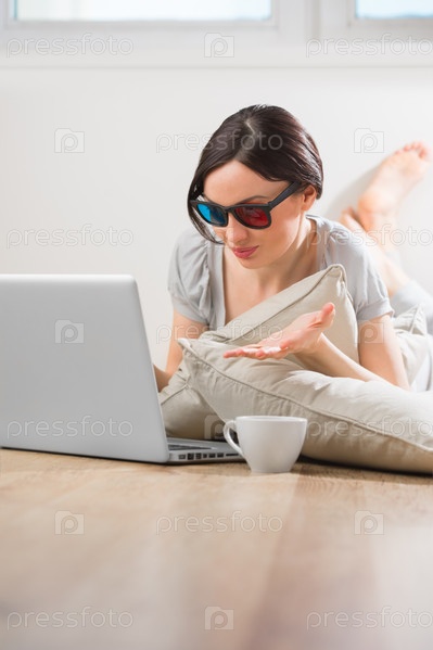 Молодая женщина лежит на полу перед ноутбуком с чашкой чая или кофе в 3D-очках и смотрит фильм