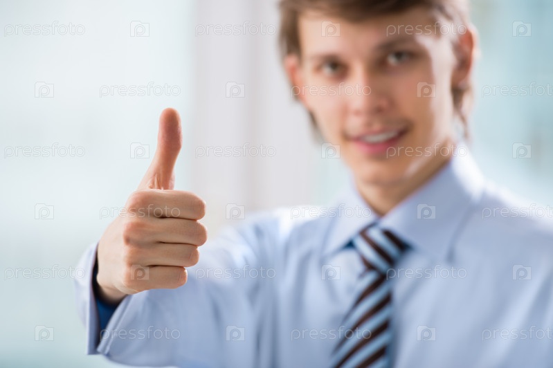 Счастливый молодой бизнесмен с поднятым большим пальцем в офисе