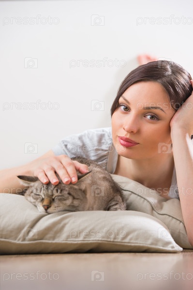 Привлекательная женщина с кошкой лежит на полу дома