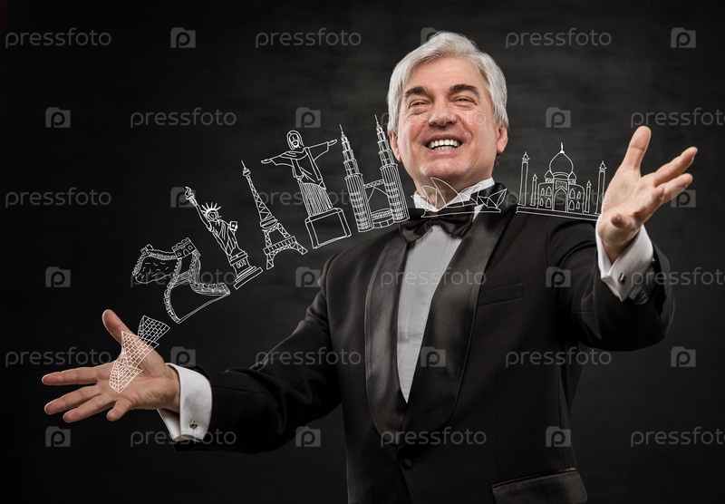 Портрет человека, играющего с виртуальными символами известных туристических направлений. Концепция туристических услуг