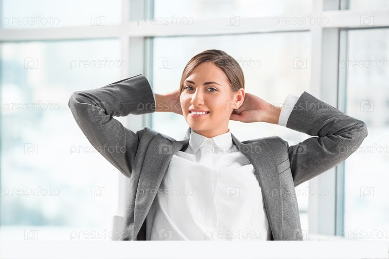Портрет молодой расслабленной бизнес-леди в офисе