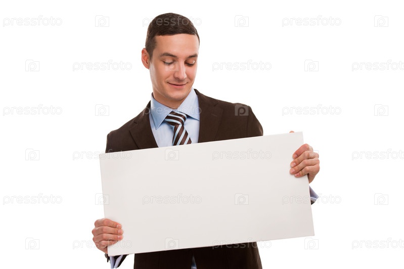 Портрет счастливого молодого бизнесмена с пустой доской на белом фоне